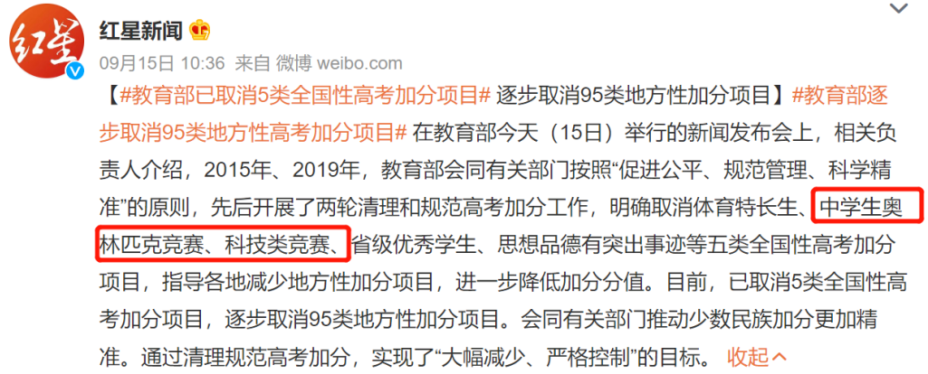 前段时间,“取消高考加分政策”的消息传得沸沸扬扬。政策明确规定,要取消体育特长生、中学生奥林匹克竞赛、科技类竞赛、省级优秀学生、思想品德有突出事迹这五类全国性高考加分项目。