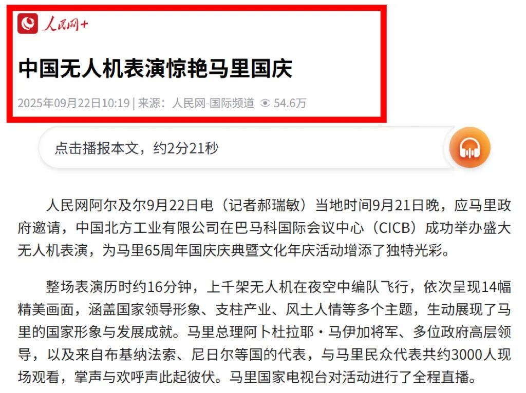 中国人民网以“中国无人机表演惊艳马里国庆”为主题,对此次活动进行专题报道。
