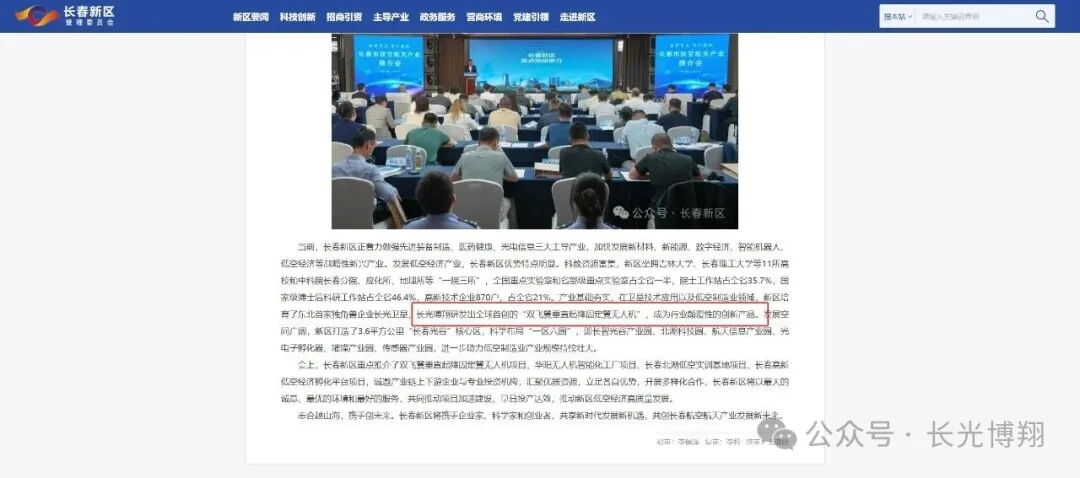 报道将长光博翔的"双飞翼垂直起降固定翼无人机"列为行业颠覆性的创新产品,并作为长春新区重点推介项目之一。
