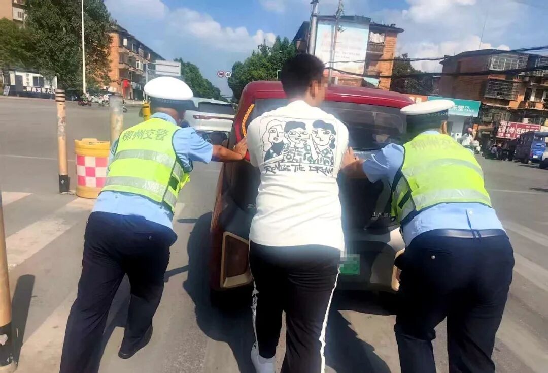 朱懋波立即摆警示标识、引导车辆避让,覃昱才询问故障后,两人分工:朱懋波控方向盘,覃昱才发力,顶着高峰车流将车推至安全区,汗水浸透制服仍专注推车。事后朱懋波叮嘱李先生联系维修、注意安全,便返岗疏导。李先生连连道谢:“太感谢了,不然真不知怎么办!”