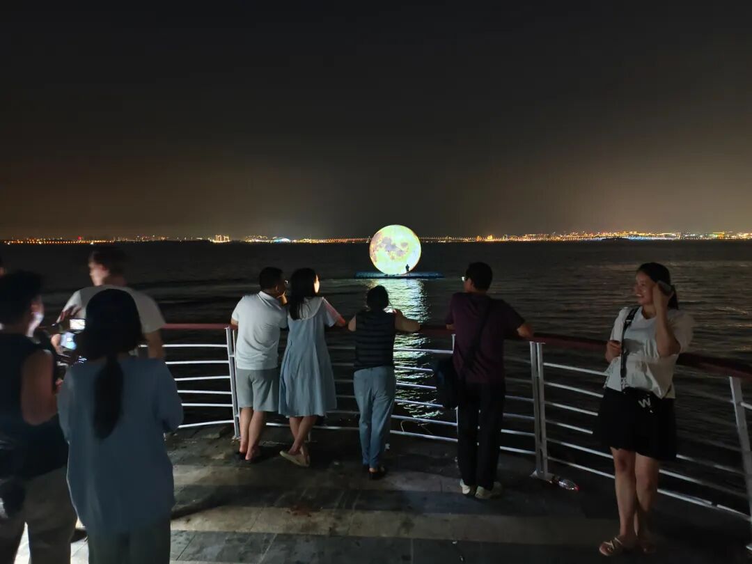 夜色下,不少摄影爱好者架起三脚架,捕捉“人月同框”的瞬间。“像‘海上生明月’,特别出片。”市民丁祥说,自己专程带家人从岛内开车过来,“白天看海,晚上赏月,孩子特别开心,朋友圈都被这轮‘海上月亮’刷屏了。”