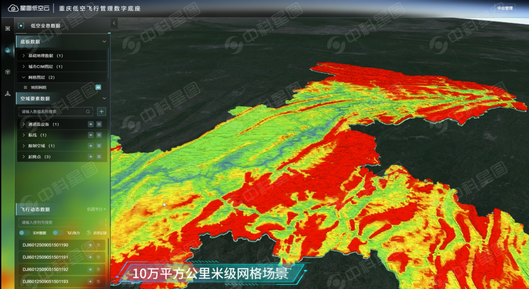 这种“天+算”的融合优势,在重庆项目中展现得淋漓尽致。重庆“山多、桥多、江多、楼密”的复杂环境,曾让不少规划者望而却步——山区与城区交错,气象条件多变,传统测绘需要数月才能完成基础建模。但中科星图依托自主研发的数字孪生建模技术,整合地形数据、倾斜摄影数据、三维点云数据、城市CIM图层等多类型数据,通过网格化构建与LOD(细节层次)技术,实现数据的高效存储与加载。目前已支持10万平方公里底板数据的网格化构建,在中等配置PC机上即可实现流畅渲染,为重庆全域低空态势可视化提供“高清数字画布”。同时在地球超算的加持下,项目可支撑十亿级网格数量的空间构建,网格精度从公里尺度直达米级——水平误差不超过0.5米,高度误差不超过0.3米。这种“细粒度”空域划分,能精准匹配重庆山地地形,为无人机航线规划、禁飞区管理等提供“精准坐标参考”。