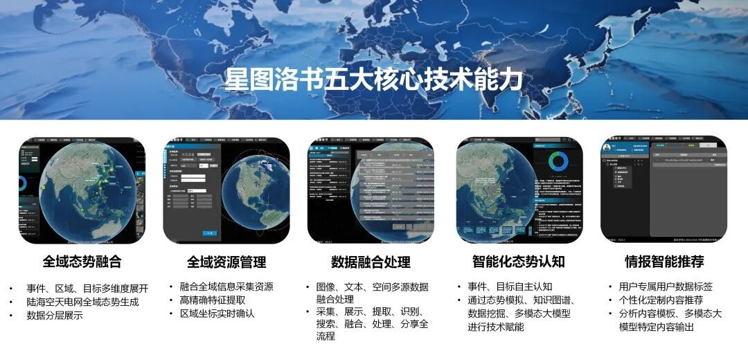 星图洛书-防务与公共安全大数据智能分析平台,基于多年来数字地球建设成果,以大数据和人工智能技术为基础,综合运用数据融合、知识图谱、遥感大模型、语言大模型等技术,融合空、天、地、海、网、电以及政治、经济、军事、社会、人文等全域数据,打造全域多模态大数据智能处理分析平台。