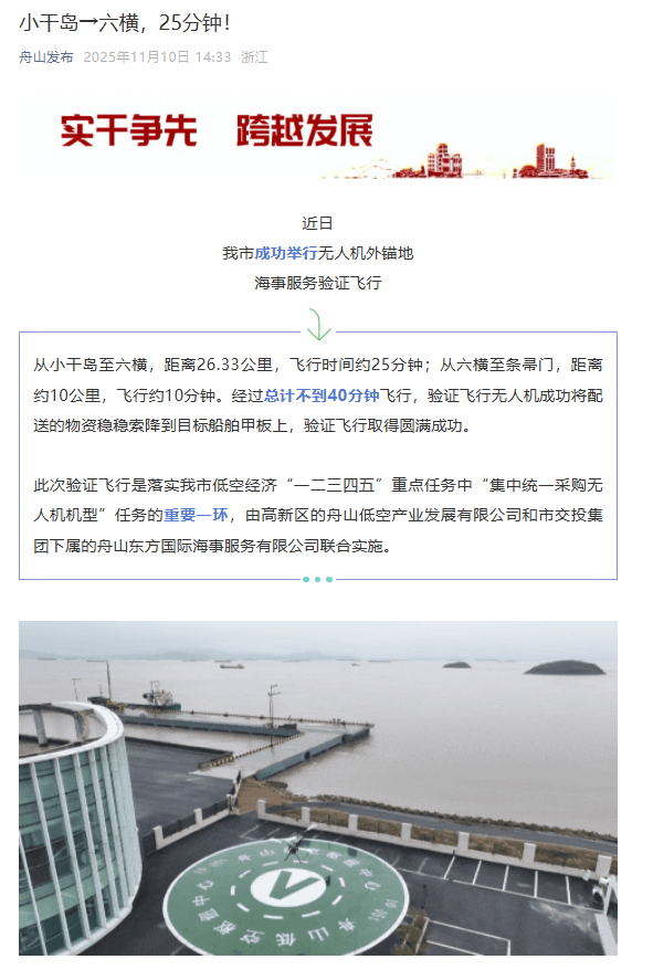 舟山海域广阔,部分区域4G/5G信号覆盖有限,微波通信又易受地形阻挡。本次飞行不仅完成了技术验证,也为舟山打造“低空经济海岛发展样板”提供了宝贵经验。