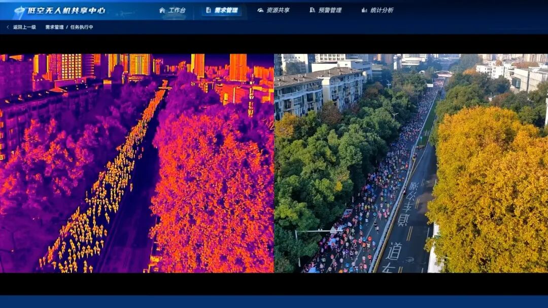 赛事结束后,无人机从高空视角复勘有无参赛者受伤、掉队、求助的情况。同时协助交管部门进行人流量和车流量监测,在人群聚集、交通堵塞的地方进行低空喊话,助力赛后交通秩序的快速恢复。