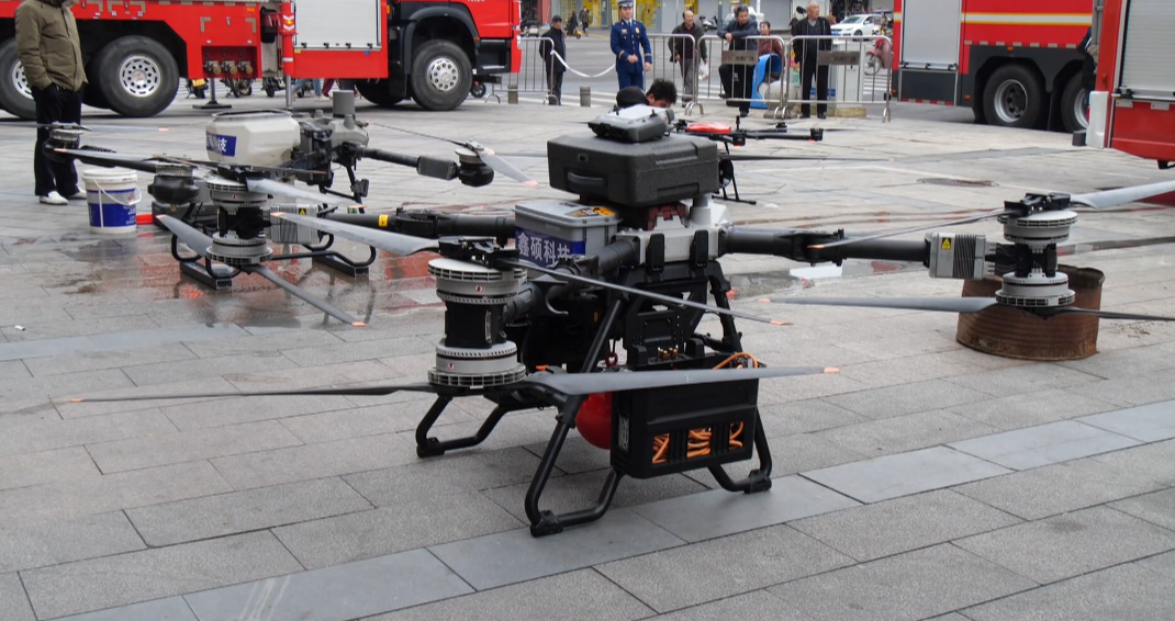本次活动中,由湖北鑫硕无人机科技有限公司带来的无人机灭火装备成为展示亮点。该设备可应用于山区、林区等复杂地形,覆盖范围达4公里,能投送灭火弹或携带60升消防水,10秒内完成投送,有效替代人员进入高危环境。