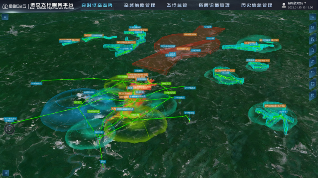 低空飞行涉及军航、民航、地方政府等多主体,“数据不通、权责不清”往往导致运行效率低下。中科星图将“协同监管”与“飞行服务”作为五位一体体系的“中枢神经”,通过领航・低空飞行服务平台,实现“纵向贯通、横向协同”,拉通全链路的低空安全运行监管。