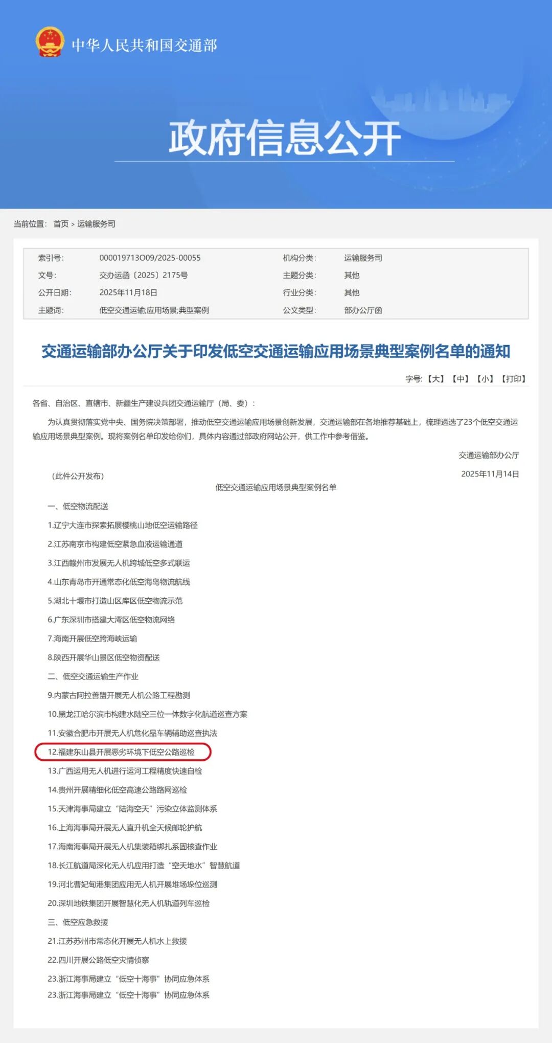 11月18日,交通运输部办公厅印发通知,发布23个低空交通运输应用场景典型案例。其中,云圣智能与东山县携手打造的“东山县空中巡管项目”场景实践成功入选,其在恶劣环境下开展低空公路巡检的解决方案,成为福建省此次唯一入选的应用案例。