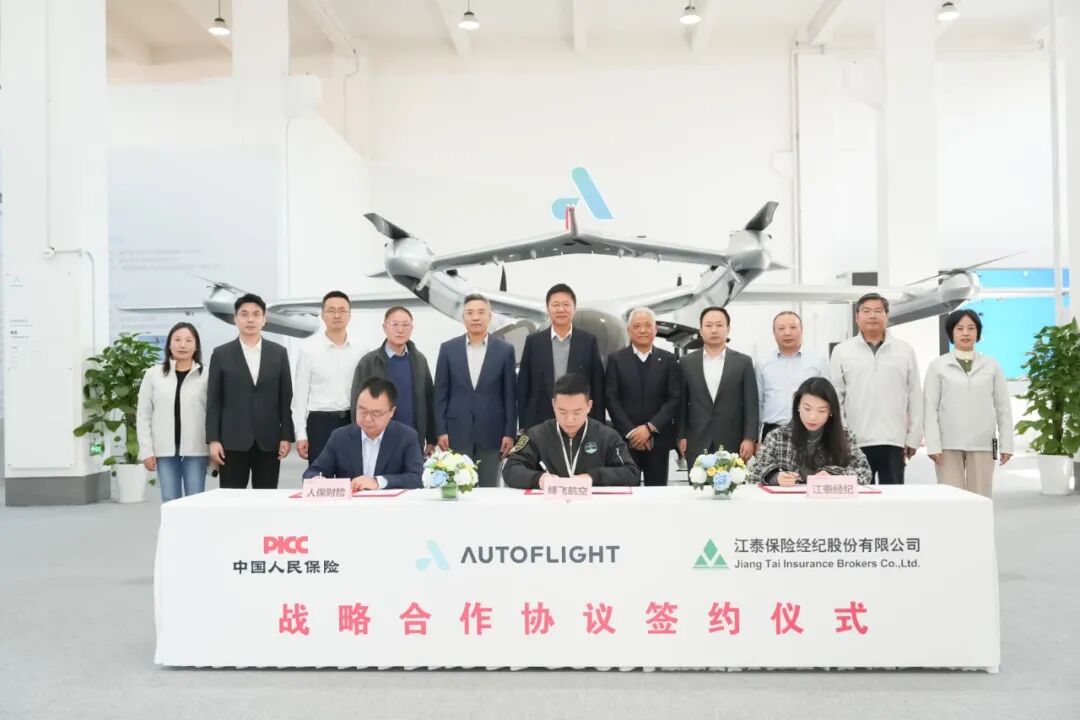 11 月 19 日,峰飞航空科技(以下简称 “峰飞航空”)与中国人民财产保险股份有限公司(以下简称 “人保财险”)、江泰保险经纪股份有限公司(以下简称 “江泰经纪”),在峰飞航空昆山基地正式签署战略合作协议。此次三方携手,以“构建航空安全新生态” 为核心,将打通低空航空器“研发-制造-运营”全链路的风险保障体系,为全球低空经济的商业化落地注入安全动能。