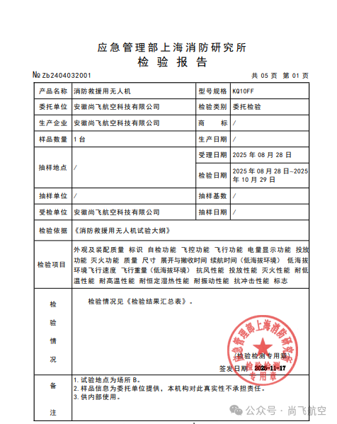 近日,KQ10FF大载重消防无人机正式通过国家消防装备质量检验检测中心的全面检测,获得权威认证证书。这标志着KQ10FF在安全性、可靠性和灭火效能上均已达到国家消防装备标准,为产品在全国范围内的推广应用提供了权威准入凭证。