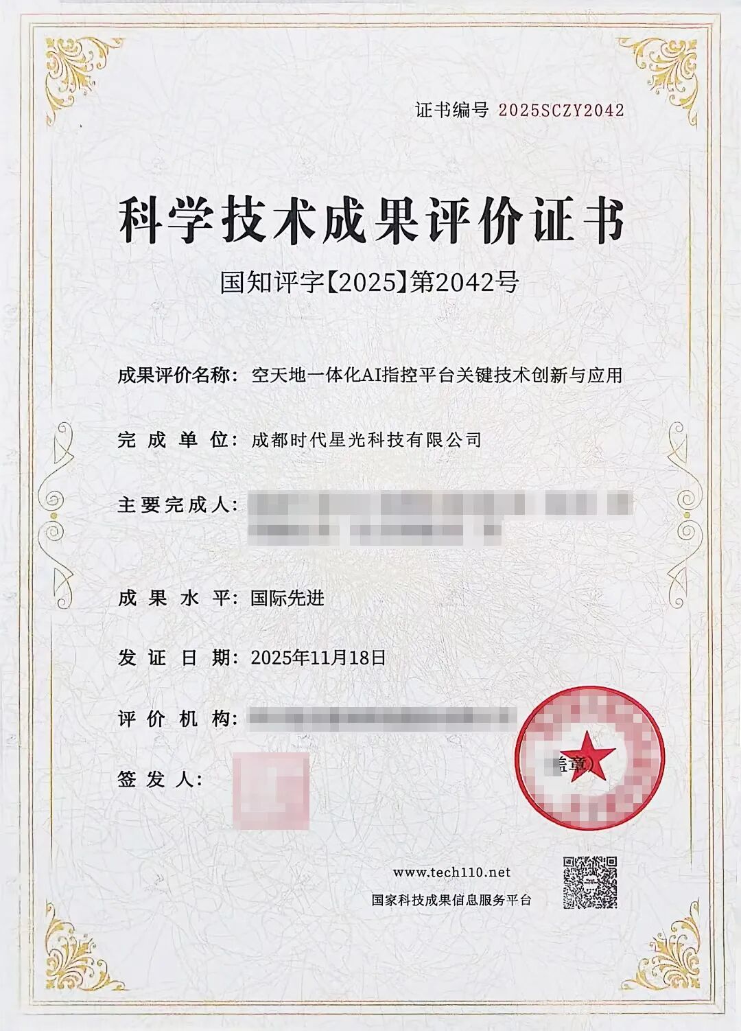 近日,时代星光科技自主研发的“空天地一体化AI指控平台关键技术创新与应用”成果顺利通过科技部授权的国家科学技术成果评价,由同济大学、西南交通大学、四川大学、电子科技大学、西南石油大学等多所高校教授、博导等组成的专家组,经研究评审一致评价达到“国际先进”水平。