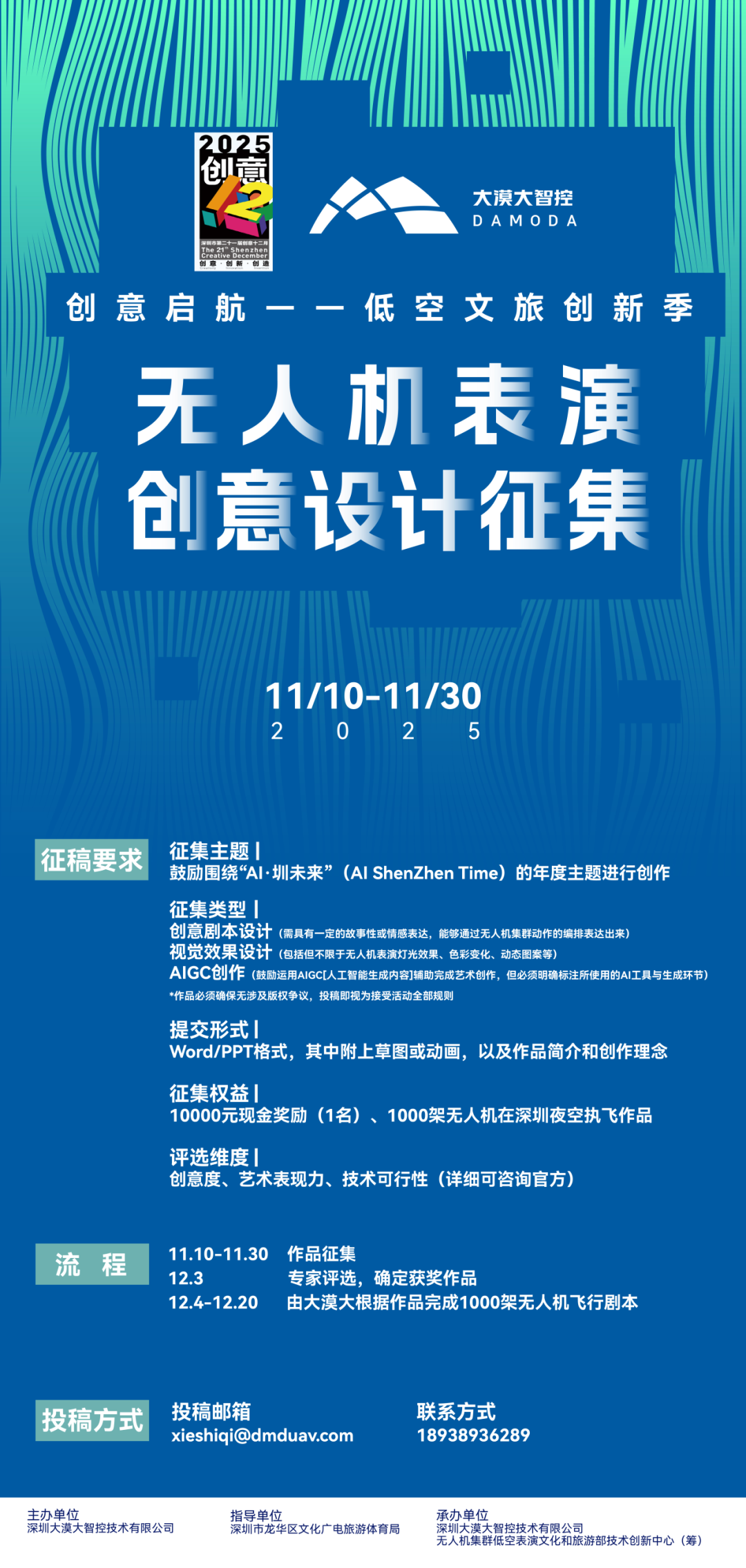 在“AI·圳未来(AI Shenzhen Time)”创意12月年度主题引领下,由深圳大漠大智控技术有限公司、无人机集群低空表演文化和旅游部技术创新中心承办的“创意启航——低空文旅创新季:无人机表演创意设计征集活动”已圆满结束。近一个月的征集期内,活动收到了不少兼具创意深度与艺术表现力的优秀方案,充分展现了无人机表演在创意设计与技术融合领域的蓬勃活力。
