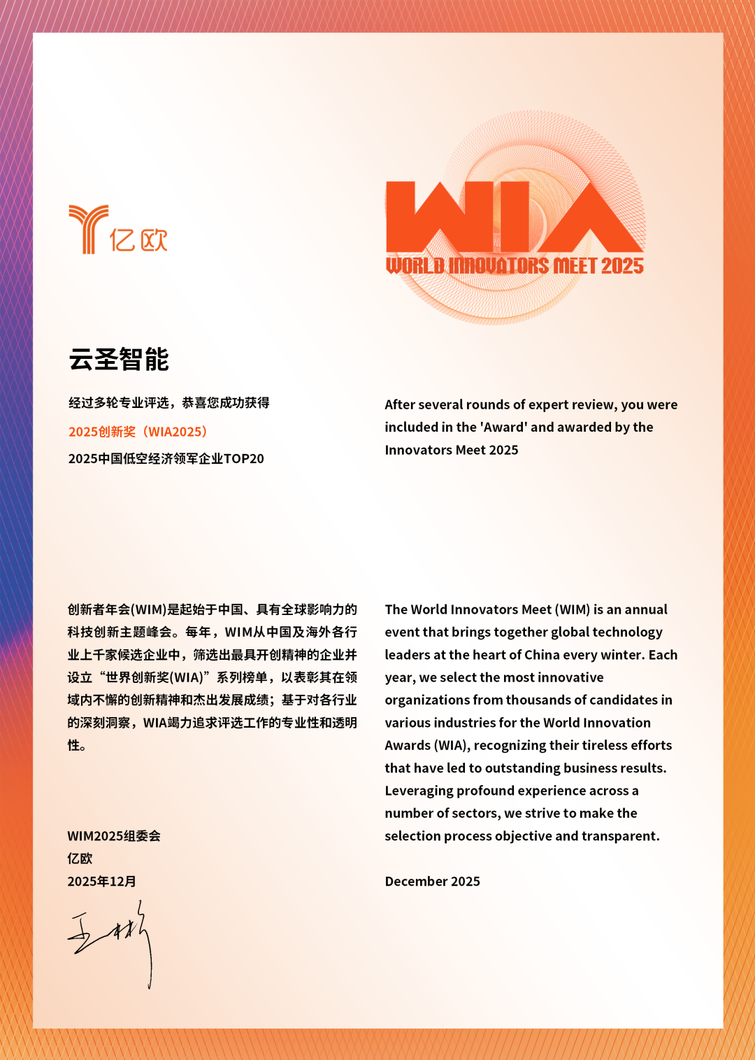近日,在备受瞩目的WIM2025创新者年会上,云圣智能凭借在低空经济领域深厚的技术积累、卓有成效的产业实践,成功入选“2025年中国低空经济领军企业TOP20”,荣膺2025创新奖(WIA2025)。同时,公司联合创始人兼首席市场官朱胜利博士应邀出席并发表主旨演讲,分享了公司对产业发展的核心洞察和前沿思考。
