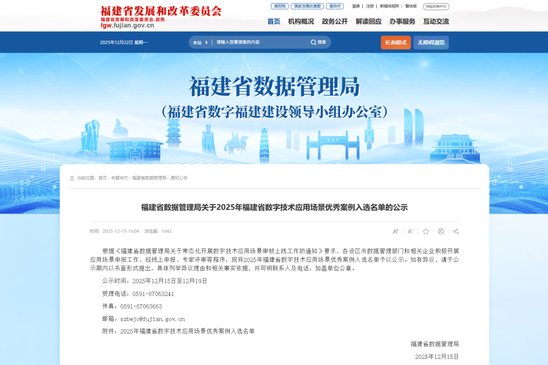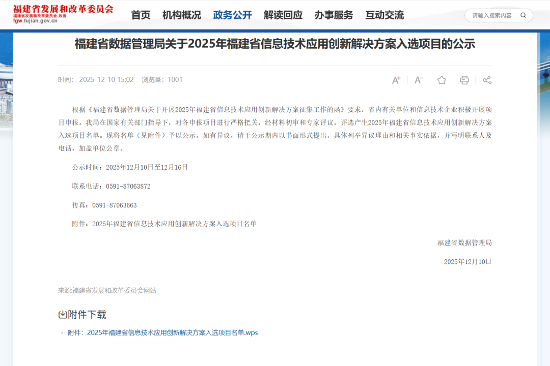 12月10日,福建省数据管理局发布《关于2025年福建省信息技术应用创新解决方案入选项目的公示》,公示名单显示,由东山县文旅集团有限公司申报,云圣智能“基于无人机和图像识别技术实现城市复杂场景的空地一体综合治理解决方案”成功入选应用示范案例。
