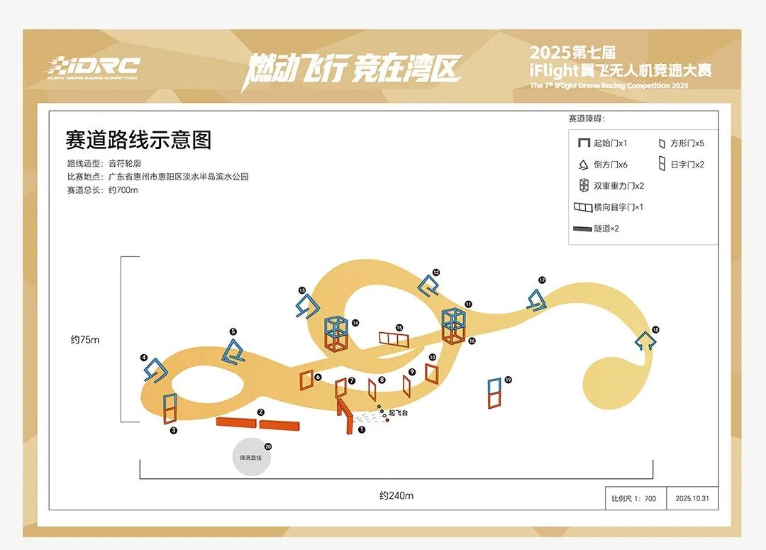 本次大赛的赛道设计别出心裁,巧妙融入惠阳作为 “吉他之都” 的文化标识,以音乐中的 “高音谱号” 为设计灵感。赛道全长约700米,设置了超过30个高难度障碍,将竞速运动的激情、音乐的韵律美感与本地特色完美结合,为选手带来了技术、创意与文化的多重挑战。