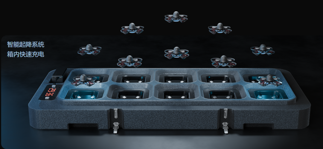 智能起降系统支持箱式起降与自动快充,能够快速组网并具备自动编号功能。这一设计彻底改变了表演流程——无人机不再需要占据舞台空间进行人工摆放和调试。