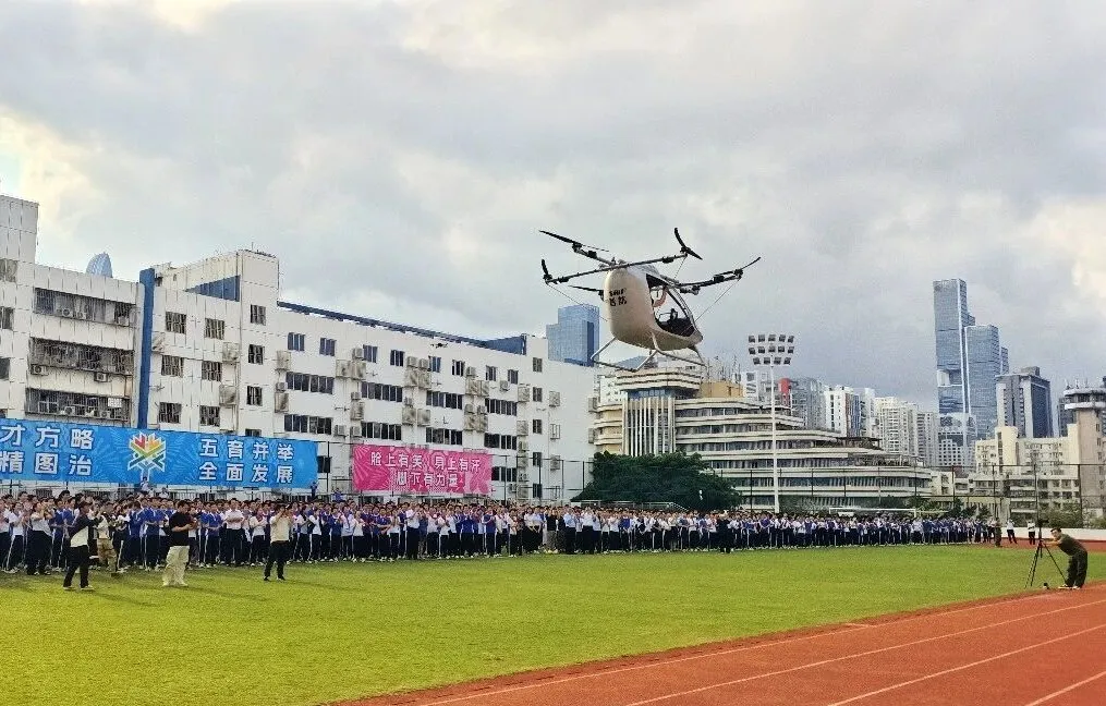 早上8点整,阳光洒在绿茵茵的足球场上,智航无人机旗下的超轻型eVTOL“子弹头”载着李校长,从足球场跑道的起点缓缓启动,螺旋桨快速转动,发出低沉而有力的嗡嗡声。随着机身逐渐离地,它轻盈地升向空中,向着舞台一侧平稳飞去。到达预定位置后,“子弹头”在空中稳稳地自旋,精准地调整好面向学生的角度缓缓降落,整个过程行云流水、一气呵成。就在它起飞的那一瞬间,全场学生爆发出雷鸣般的欢呼声,那热烈的声浪仿佛要将整个操场都掀翻。