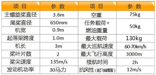环鹰二号无人直升机以其优异的气动效率、重量效率、续航能力及操稳特性受到农业部和航空植保企业的高度重视,可用于农业航空植保、电力巡线、应急救灾等多个领域该机最大载荷可达50kg,飞行时间2小时,是目前同类产品中性能最优越机型。