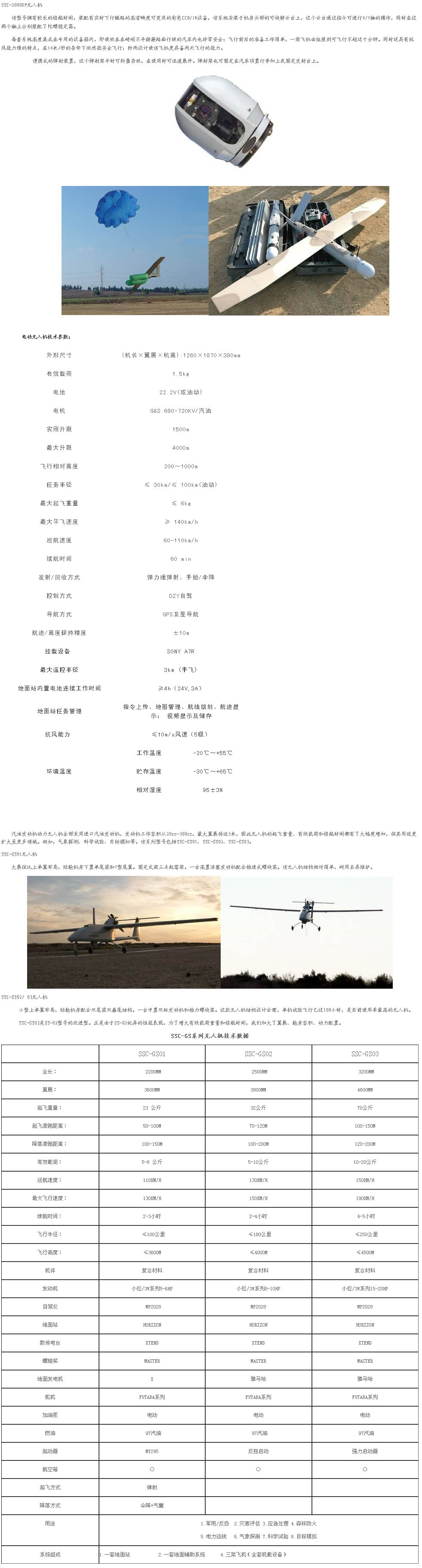 电动(EP)无人机具有使用维护简便、声音特征信号低、可低空低速巡航特点,包括SSC-1000EPmini、SSC-2000EP两个型号。