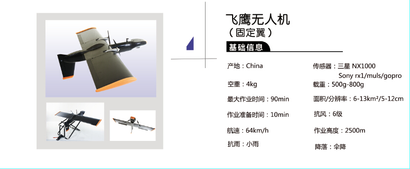 天合(THD-PAN)飞鹰低空遥感航测无人机作为一种高性能、多功能、自动规范化、易操作、安全可靠电动无人机,可同时搭载高清摄像系统、高分辨率照相系统,用以同步获取视频与航片,同时具备60-90分钟续航能力。单架次可调查面积达15平方公里,可配带多块高性能电池,全天可循环连续作业4-10架次。可适应各类复杂地形的起降;可适应多种天气情况,抗风能力达6级,雨天可执行任务。天合(THD-PAN)飞鹰无人机体属固定翼型式,机体材质为碳纤维。