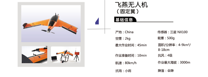 天合(THD-PAN)飞燕系列低空遥感航测无人机作为国内最轻便灵活型(起飞重量2.5kg)、最安全简易型、高性价比、配备高稳定性自动化飞行控制系统,搭载高分辨率(优于2000万像素)航拍相机,可低空拍摄地面真实情况,分辨率优于0.08m,具备40-60分钟续航能力。机体材质使用碳纤维;可抗连续性冲击、抗静电、抗导电,维修保养方便,机身同时为可简易拆卸外壳。单架次可调查面积达5-10平方公里,作业可配带多块高性能电池,全天可循环连续作业4-10架次。飞燕无人机机身轻便,对机体自身及第三方安全性均较高,抗风能力达5级,可适应各类复杂地形的起降。