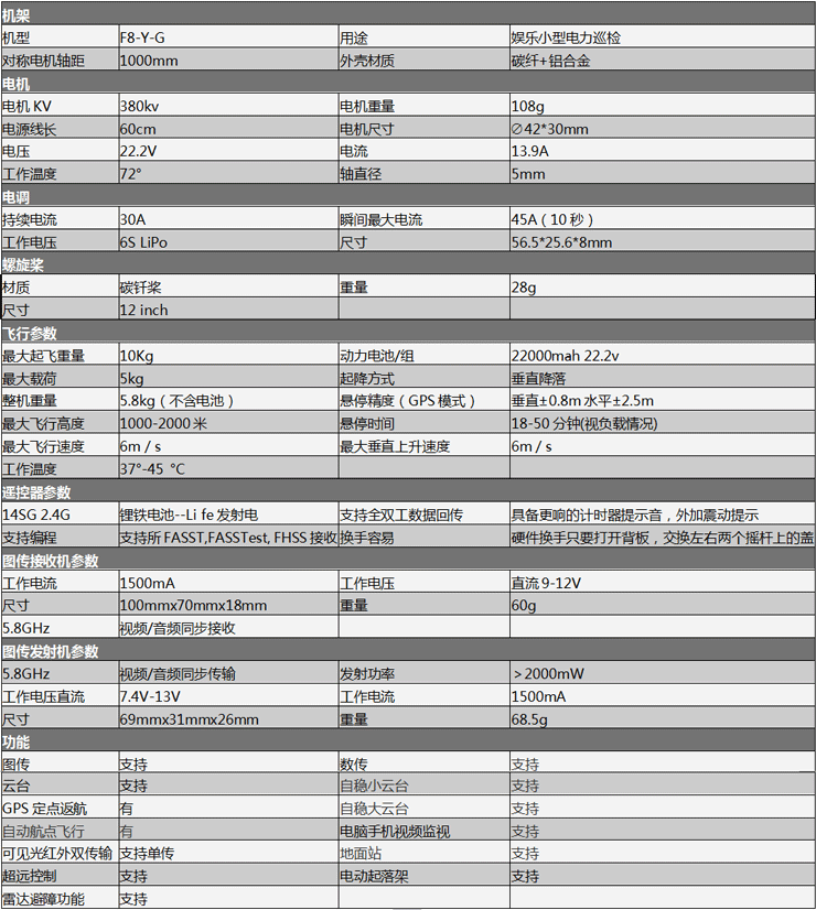 该飞行器性能卓越,采用全碳纤结构机身、工业级飞控、高效率动力系统、专业数传及图像传输系统、专业云台控制系统等一些列高科技手段精心锻造,具有重量轻、效率高、载重大、续航能力强、飞行参数先进性价比高等特点。广泛运用于航拍、侦查、救援、电力巡线、植保、森林防火、测绘等领域。