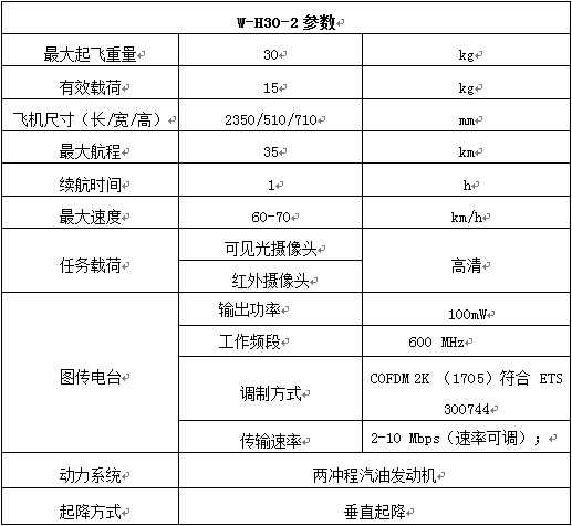 W-H30-2无人机应用自主飞行控制系统,搭载光电吊舱任务载荷,可实现自主飞行。应用于航拍航摄、电力线的架设和巡检、农林业的病虫害监测、高速路交通管制等领域,相较电机型无人机具有抗风性强,续航时间强的优势。