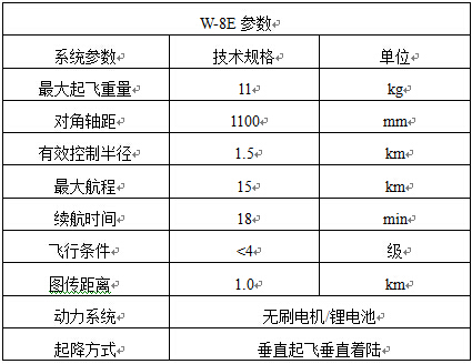 W-8E无人机应用半自主飞行控制系统,搭载高清图传系统,具备起落架自主收放功能。续航时间可达18分钟。可广泛应对各种航拍航摄、定点搜索、协调指挥、影像录制等空中任务。