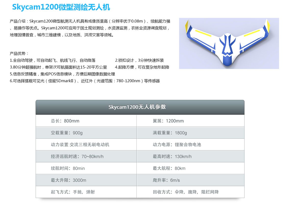 Skycam1200机身全部采用圆滑设计,巧妙地利用了空气动力学原理,不仅使得机身线条流畅美观,而且飞行稳定。整台飞机做工细致。细节部位处理非常合理。