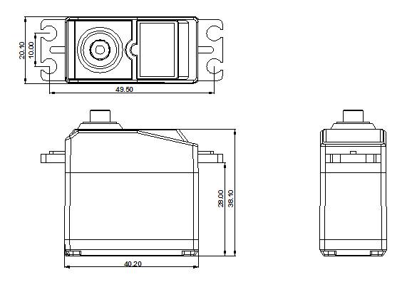 尺寸(长*宽*高): 40.2 x 20.1 x 38.1mm 重量: 78g 速度: 0.19 s/60°at 4.8V, 0.15 s/60°at 6V