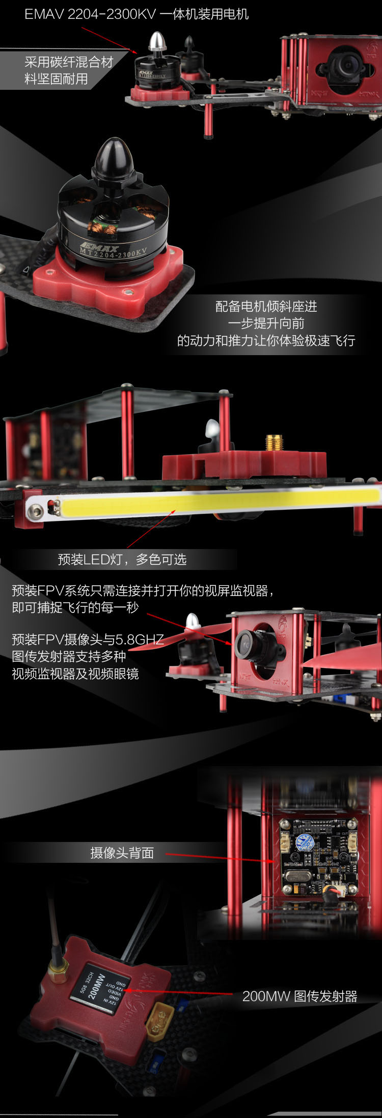 2.预装程度高,配置齐全。预装EMAX 强劲动力系统和开源飞控系统,提供强劲动力和用户自主可调性。RTF 版本在安装电池和螺旋桨后即可直接飞行。