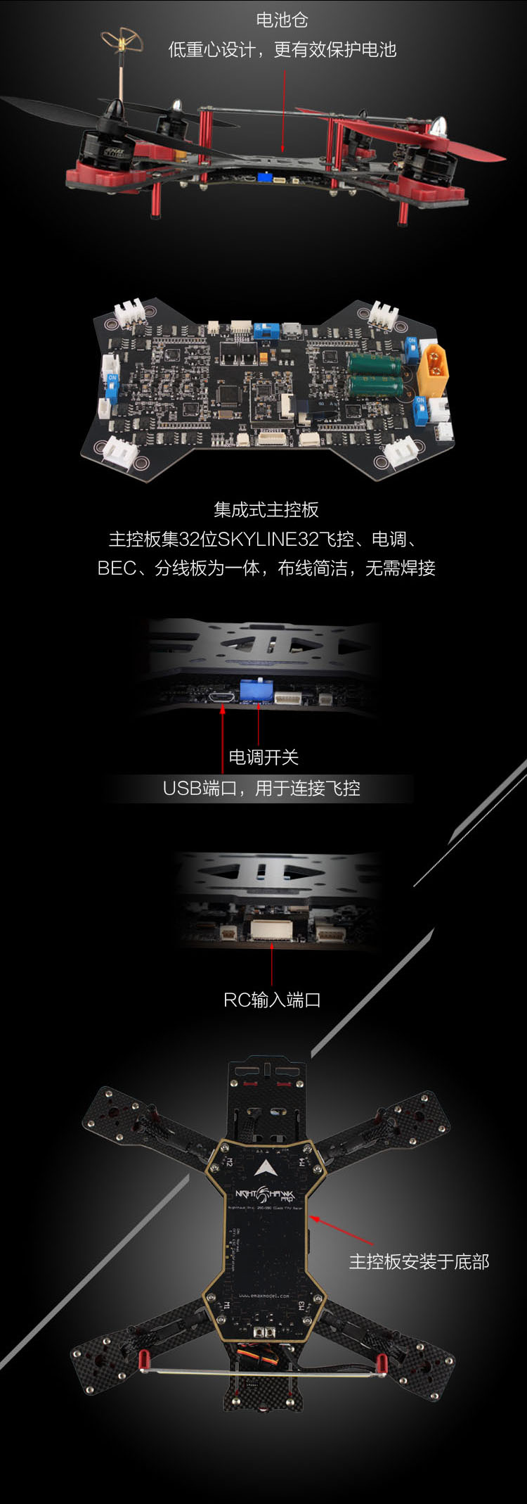 13.电调采用EMAX 12A 硬件,支持BLHeli 开源固件,具备ONESHORT 功能;飞控是基于NAZE32 的Skyline32硬件,支持baseflight 和cleanflight 开源固件。本产品预装baseflight 开源固件。