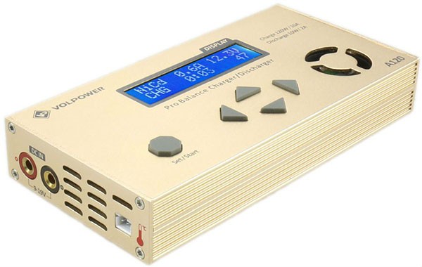When the charger is charging, the product model and company logo(A120 volpower) show on the display, then into PROGRAM SELECT LIPO PATT interface. At this point, LIPO BATT flashing, press the down key into program selection interface USER SET, LOAD DATA, PB BATT ,NICD BATT, NIMH BATT,LIFE BATT,LIHV BATT,LION BATT in turn.