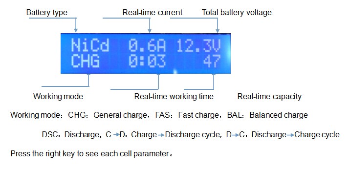 At this time the LiPo BATT words flashing, press the right keys to enter the work mode selection, current selection, voltage selection, start selection, preservation channel selection, time setting selection, capacity setting selection. Press the up and down keys, set the flashing parameters. Press Set/Start button to start or stop the charger.(setting mode of LiFe, LiHV, LiIo is the same with LiPo)