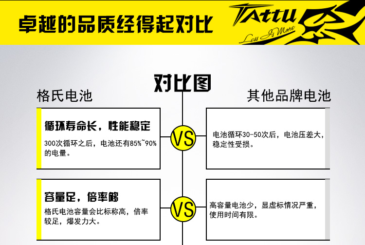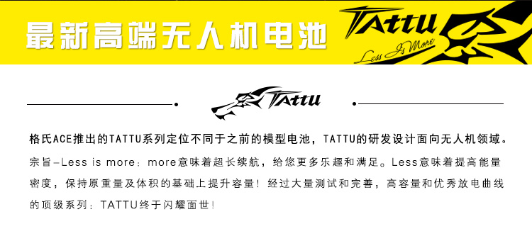 深圳市格瑞普电池有限公司专业无人机品牌”TATTU". TATTU全新无人机系列电池定位为无人机行业的专业品牌,TATTU再一次颠覆了模型的概念,让广大用户对无人机动力配套有了全新的认识。我们一直在致力研发新品以更好的配合无人机产品的飞行需求,TATTU闪耀面世,意味着格氏品牌在无人机行业的全新变革,无论从外观包装还是电芯工艺我们都力求完美。