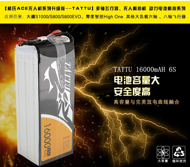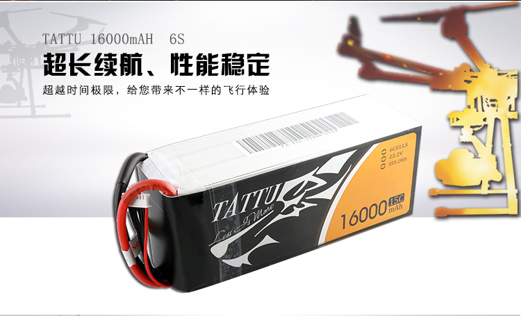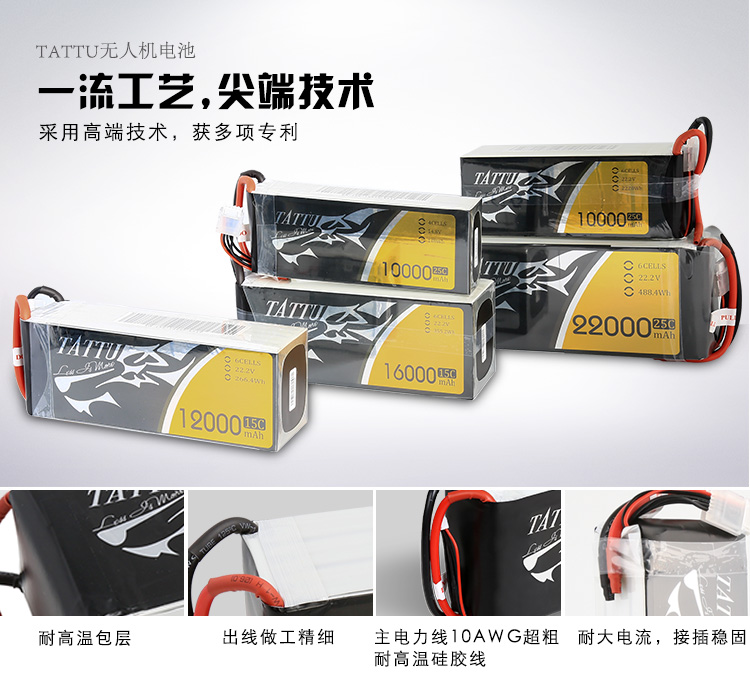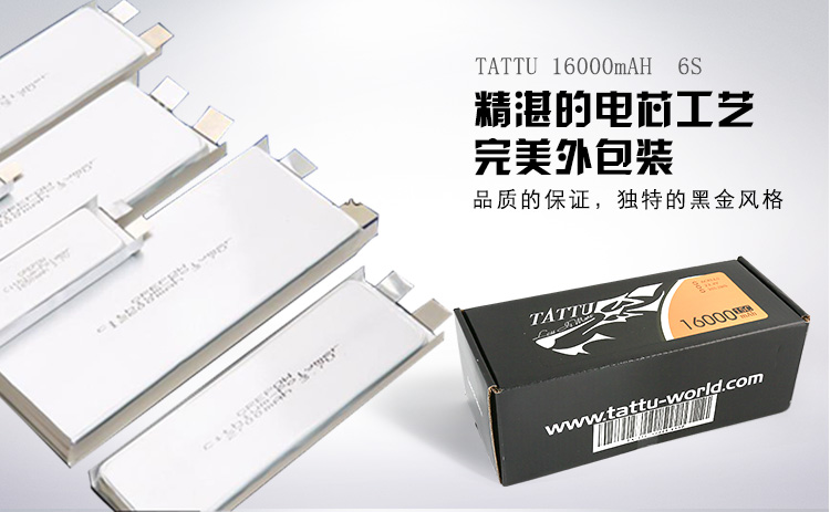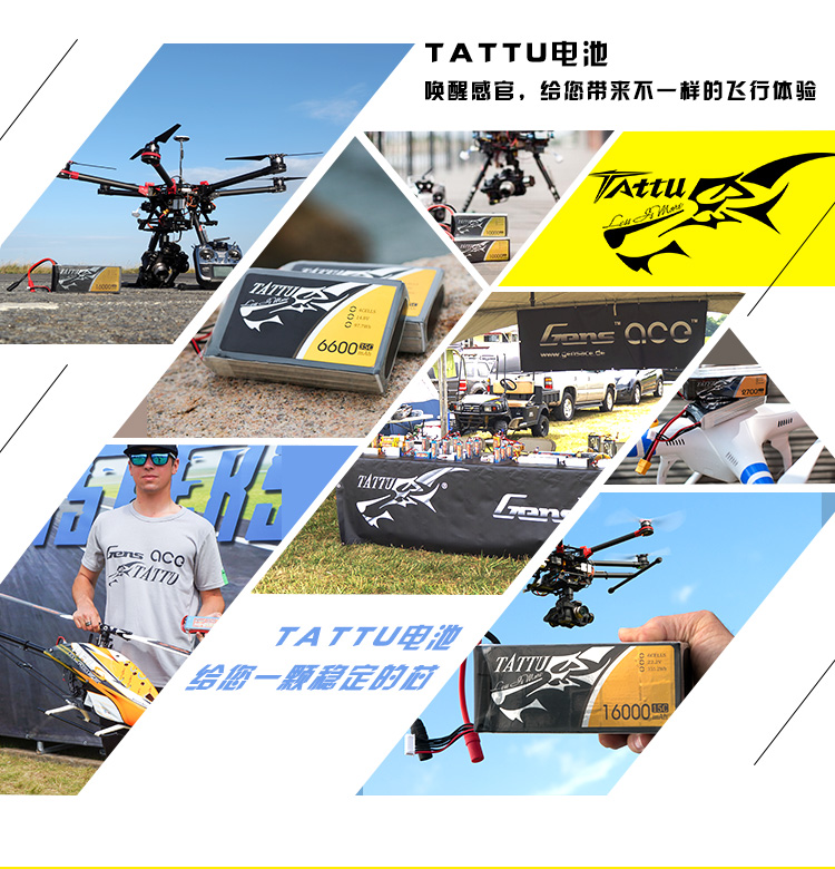 TATTU全新无人机系列电池定位为无人机行业的专业品牌,TATTU再一次颠覆了模型的概念,让广大用户对无人机动力配套有了全新的认识。我们一直在致力研发新品以更好的配合无人机产品的飞行需求,TATTU闪耀面世,意味着格氏品牌在无人机行业的全新变革,无论从外观包装还是电芯工艺我们都力求完美。 TATTU针对无人机工业配套,可在影视航拍、农业植保、地质勘测、 森林防火、抗洪抢险、环境监测等领域广泛应用,相信可以给广大用户带来不一样的飞行体验。因为专注,所以选择;因为专业,所以信赖。