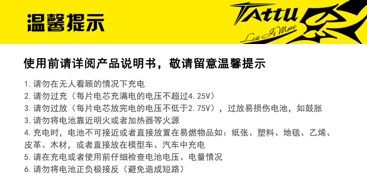 TATTU全新无人机系列电池定位为无人机行业的专业品牌,TATTU再一次颠覆了模型的概念,让广大用户对无人机动力配套有了全新的认识。我们一直在致力研发新品以更好的配合无人机产品的飞行需求,TATTU闪耀面世,意味着格氏品牌在无人机行业的全新变革,无论从外观包装还是电芯工艺我们都力求完美。 TATTU针对无人机工业配套,可在影视航拍、农业植保、地质勘测、 森林防火、抗洪抢险、环境监测等领域广泛应用,相信可以给广大用户带来不一样的飞行体验。因为专注,所以选择;因为专业,所以信赖。