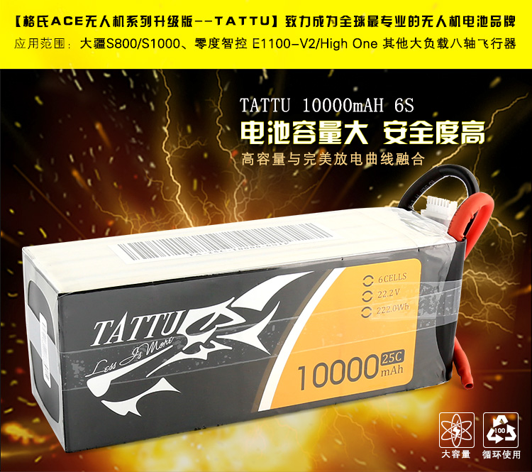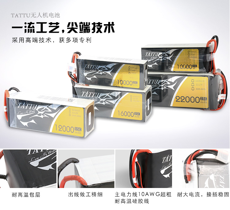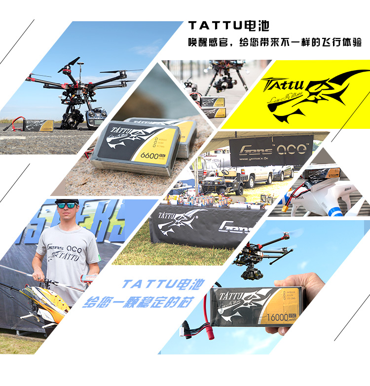 TATTU全新无人机系列电池定位为无人机行业的专业品牌,TATTU再一次颠覆了模型的概念,让广大用户对无人机动力配套有了全新的认识。我们一直在致力研发新品以更好的配合无人机产品的飞行需求,TATTU闪耀面世,意味着格氏品牌在无人机行业的全新变革,无论从外观包装还是电芯工艺我们都力求完美。 TATTU针对无人机工业配套,可在影视航拍、农业植保、地质勘测、 森林防火、抗洪抢险、环境监测等领域广泛应用,相信可以给广大用户带来不一样的飞行体验。因为专注,所以选择;因为专业,所以信赖。