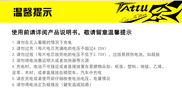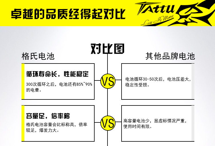 深圳市格瑞普电池有限公司专业无人机品牌”TATTU". TATTU全新无人机系列电池定位为无人机行业的专业品牌,TATTU再一次颠覆了模型的概念,让广大用户对无人机动力配套有了全新的认识。我们一直在致力研发新品以更好的配合无人机产品的飞行需求,TATTU闪耀面世,意味着格氏品牌在无人机行业的全新变革,无论从外观包装还是电芯工艺我们都力求完美。