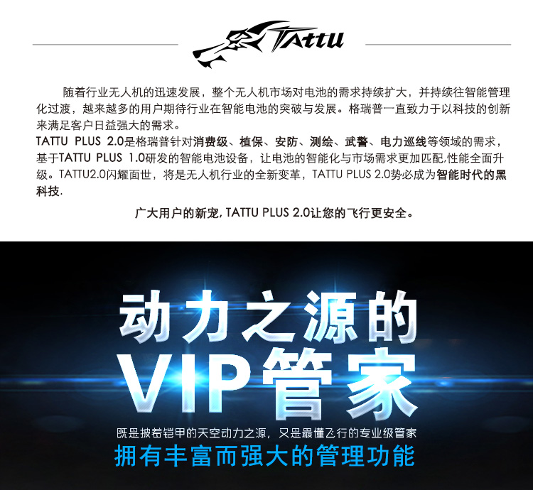 深圳市格瑞普电池有限公司专业无人机品牌”TATTU". TATTU全新无人机系列电池定位为无人机行业的专业品牌,TATTU再一次颠覆了模型的概念,让广大用户对无人机动力配套有了全新的认识。我们一直在致力研发新品以更好的配合无人机产品的飞行需求,TATTU闪耀面世,意味着格氏品牌在无人机行业的全新变革,无论从外观包装还是电芯工艺我们都力求完美。