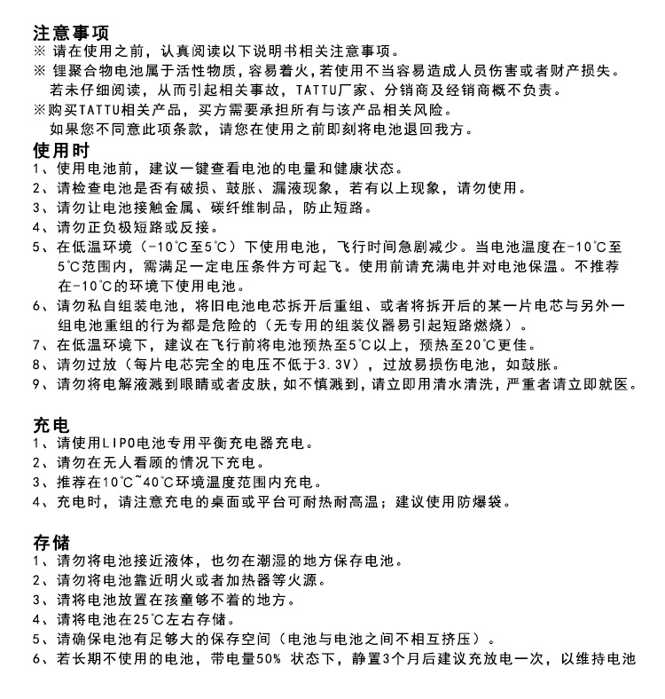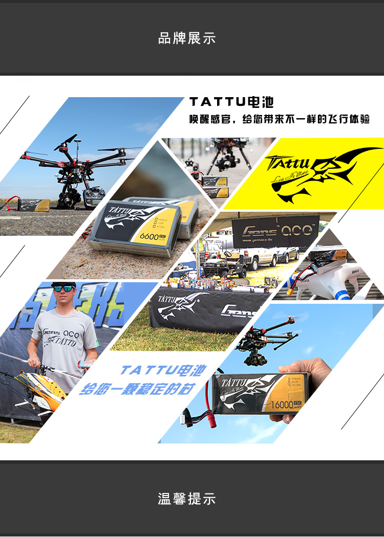 TATTU全新无人机系列电池定位为无人机行业的专业品牌,TATTU再一次颠覆了模型的概念,让广大用户对无人机动力配套有了全新的认识。我们一直在致力研发新品以更好的配合无人机产品的飞行需求,TATTU闪耀面世,意味着格氏品牌在无人机行业的全新变革,无论从外观包装还是电芯工艺我们都力求完美。 TATTU针对无人机工业配套,可在影视航拍、农业植保、地质勘测、 森林防火、抗洪抢险、环境监测等领域广泛应用,相信可以给广大用户带来不一样的飞行体验。因为专注,所以选择;因为专业,所以信赖。