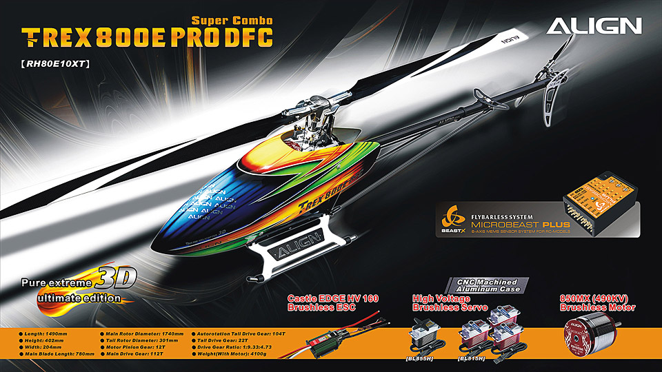T-REX 800E PRO DFC可以说是目前亚拓顶级旗舰机种,最新颖的设计理念与最高阶的配备,具备高质感与亮眼的外型,加上纯正3D飞行的血统,绝对能沸腾您血液里的暴力因子。