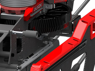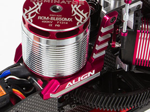动力选用最高规格,经国际赛事肯定的世界冠军马达-ALIGN 850MX(490KV/4535), 具备高扭力、高转速、高效率的优点,加上马达散热片设计巧思,除了强化机身结构外,并提供马达散热功能,平均可降低达20°C的效果,此外造型外观前卫,加入红色阳极处理,更能显现出直升机的高质感 。搭载RCE-BL130A电子调速器,优异定速功能,最强动力完全给足。全新高压无刷DS820M/DS825M伺服器,采用超高效率的无刷马达,具备超高扭力与超快速度反应,让直升机动作更快、更确实,全金属CNC切削的优美精致散热外壳,突显出顶级伺服器的高质感。