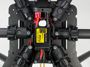 碳纤维埋射高强度工业塑胶一体成型的马达座,造型流线具备高强度、轻量化与吸震优点。马达座内置40A高速电子变速器,可切换马达转向,具备高亮度LED方便飞行辨识,灯号颜色(红灯/白灯)可随需求切换,与低电压警示功能。