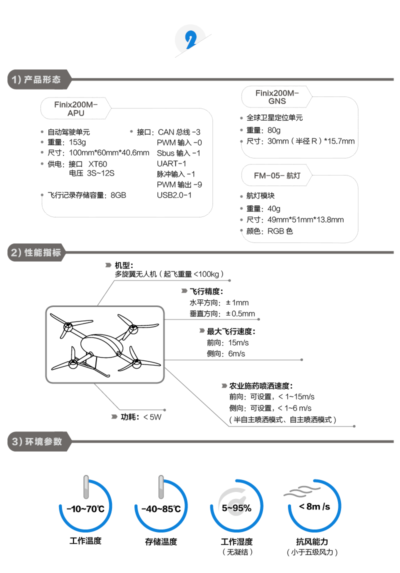 全新Finix200M植保多旋翼飞控系统采用高集成结构设计, 结合安全可靠和精准控制的特性,为用户提供更多选择。