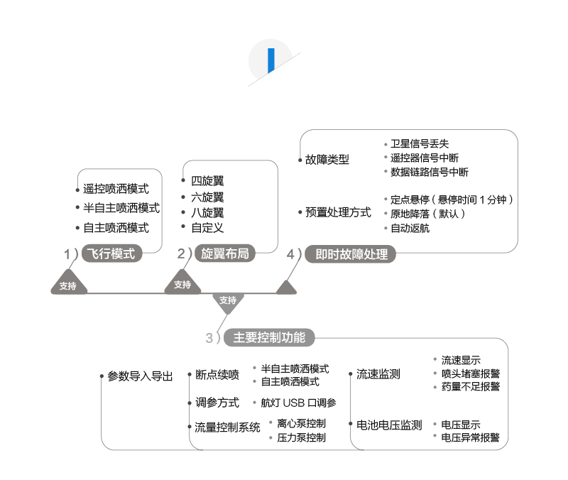 半自主作业模式。应用电子围栏技术,在智能药量喷洒控制的辅助下,兼顾遥控喷洒的灵活及自主喷洒的便捷。只需简单方便的遥控器操作,即可在复杂多变的环境下,实现高效可控的作业效果。