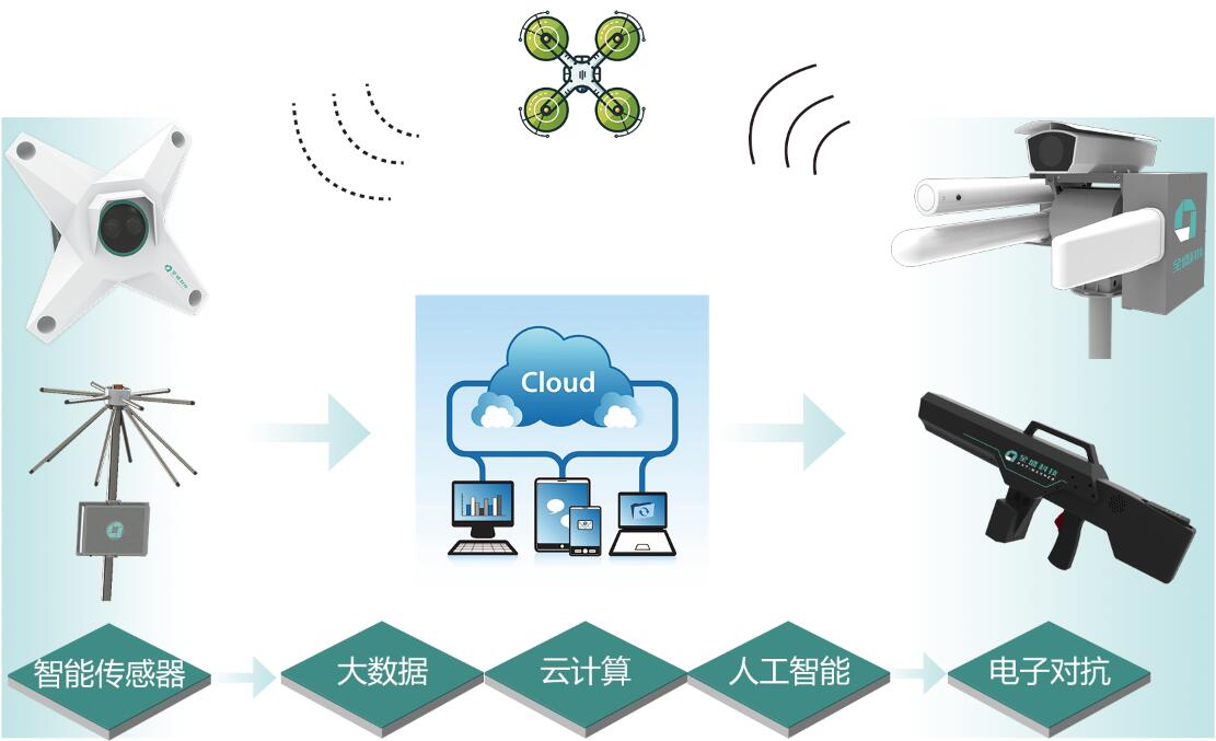 BAT反无人机系统采用分布式结构,前端智能硬件和电子对抗系统具有灵活配置能力,后端管理平台通过前端检测数据的反馈,并结合大数据技术进行数据分析,为管理平台的机器学习不断提供无人机样本,系统准确高效的判断无人机并快速指挥联动压制系统和干扰系统进行远近距离的侦测、跟踪、识别和管控,实现7x24小时全方位守卫低空安全。