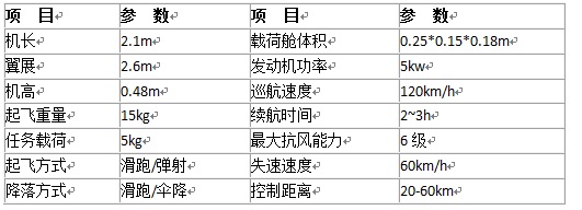 技术特性 1、采用传统布局,前拉式发动机,支撑为后三点滑橇起落架,弹射起飞/定点伞降。 2、机身轻巧,基于弹射架起飞,对起飞降落场地要求不高,操作简单方便, 3、抗冲击能力较强,采用军标软体大容量油箱,航程250公里左右。 4、自动驾驶系统60千米范围的无线数据链,确保无人机在作业时和地面站的通讯 5、程序设有失控保护选项,可以根据用户的需求设定,使飞机在紧急情况下安全降落。 6、‘自动驾驶控制系统采用总能量控制的非线性导航算法(来源于导弹制导算法),导航精度高、抗风性能好,飞机在极限状态下也可以保持良好的姿态,安全性高。 7、电器连接部分,采用符合军标的矩形电连接器,保证连接系统的可靠性。