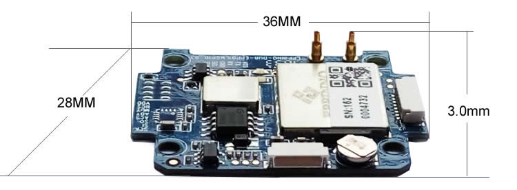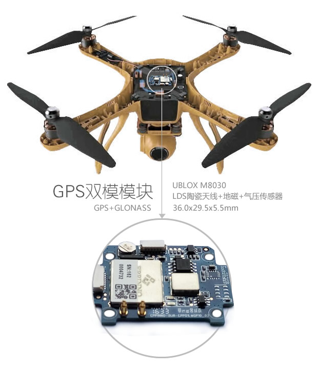 采用镭雕天线,不占重量和空间,对于重量和体积很敏感的超小型无人机来说,镭雕天线是最好的选择,PCBA重量仅4克,去掉了10克重的陶瓷天线和天线所占用的面积,而且镭雕天线不受方向限制,在720度翻转飞行的时候不担心丢失定位。