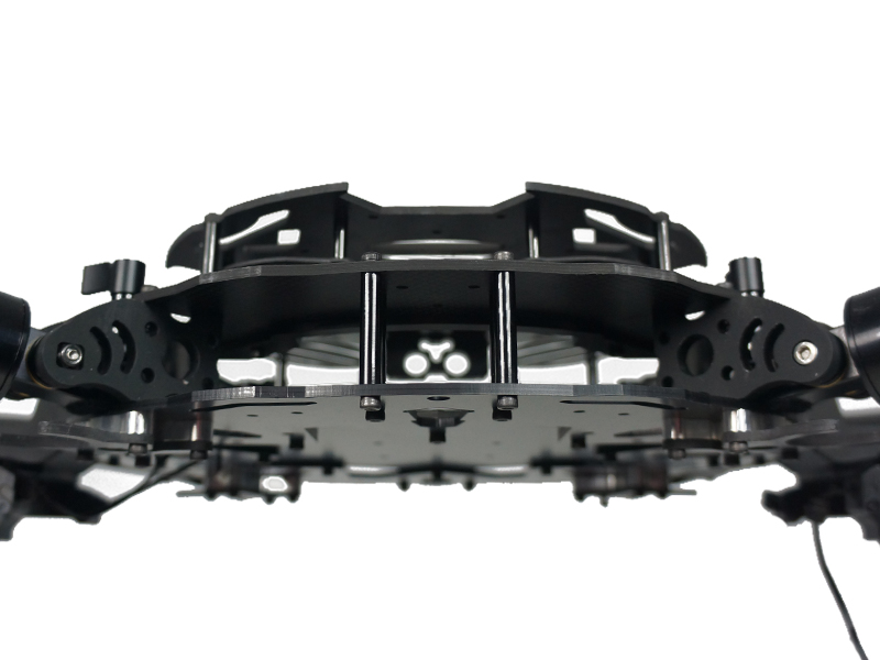 D130强化的中心减震板,由4mm碳纤维板和4毫米铝板组成,增加了专用加强环结构,加粗后的力臂直径为30mm,厚度增加为2mm。新的起落架系统扩展了机架下方空间,使机架下方有更大的空间用于挂载大型航拍设备。